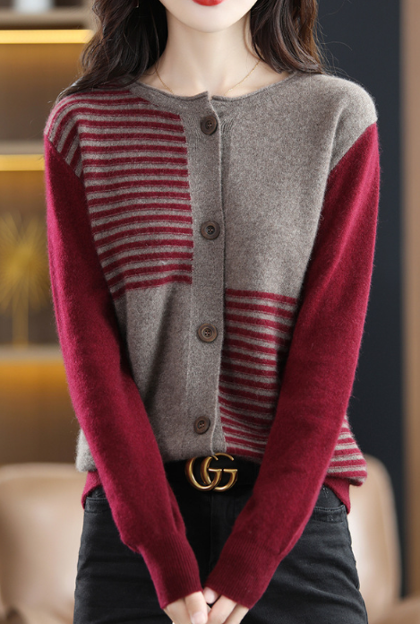 여성 가을 라운드넥 니트 가디건 스웨터 투톤 줄무늬 배색 싱글 버튼 3색상 5사이즈 (S~2XL)