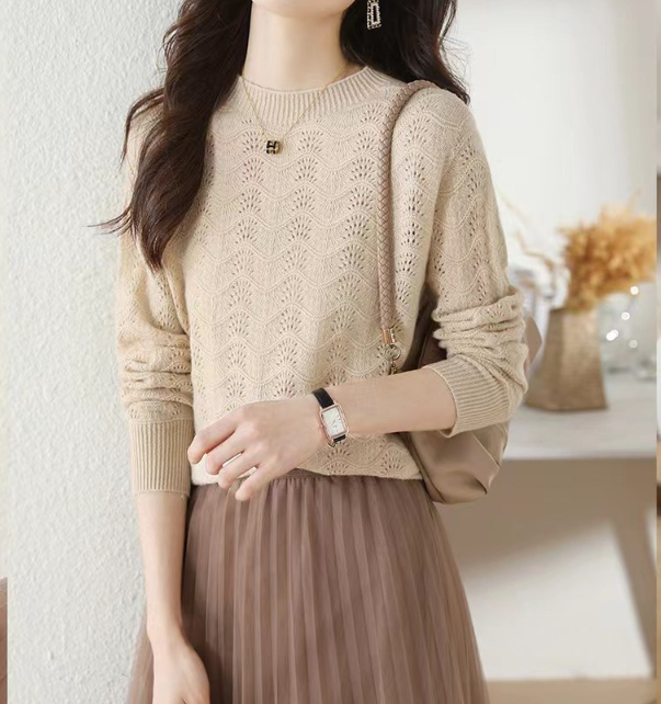 긴팔 가을 라운드 넥 펀칭 니트 스웨터 베이지 레드 2 색상 5 사이즈 (S~XL~프리사이즈)