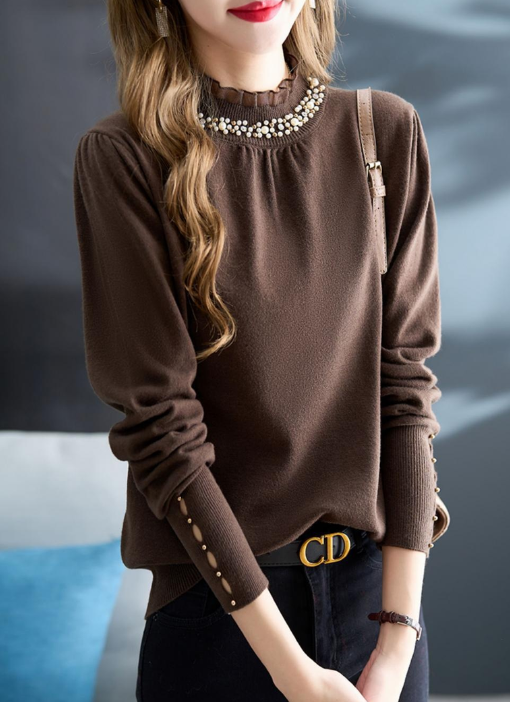 하프 터틀 레이스 프릴넥 긴팔 니트 스웨터 반목폴라 비즈장식 소매디자인 2색상 프리사이즈